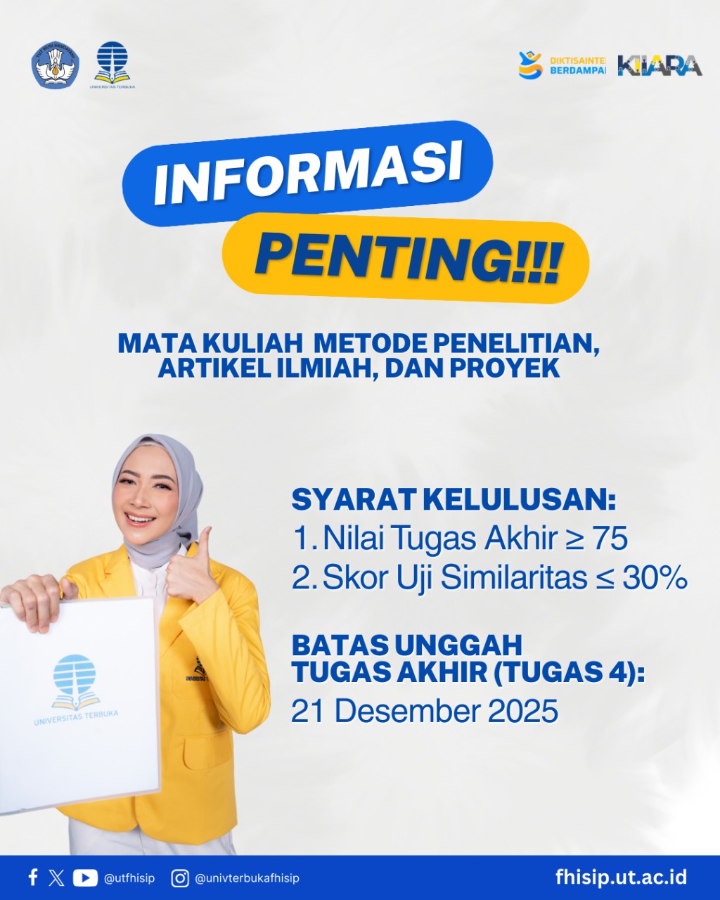 Bagi yang menempuh mata kuliah Metode Penelitian, Artikel Ilmiah, dan Proyek pada semester 2025/2026 Ganjil, jangan terlewat batas unggah tugas akhir (Tugas 4): 21 Desember 2025.