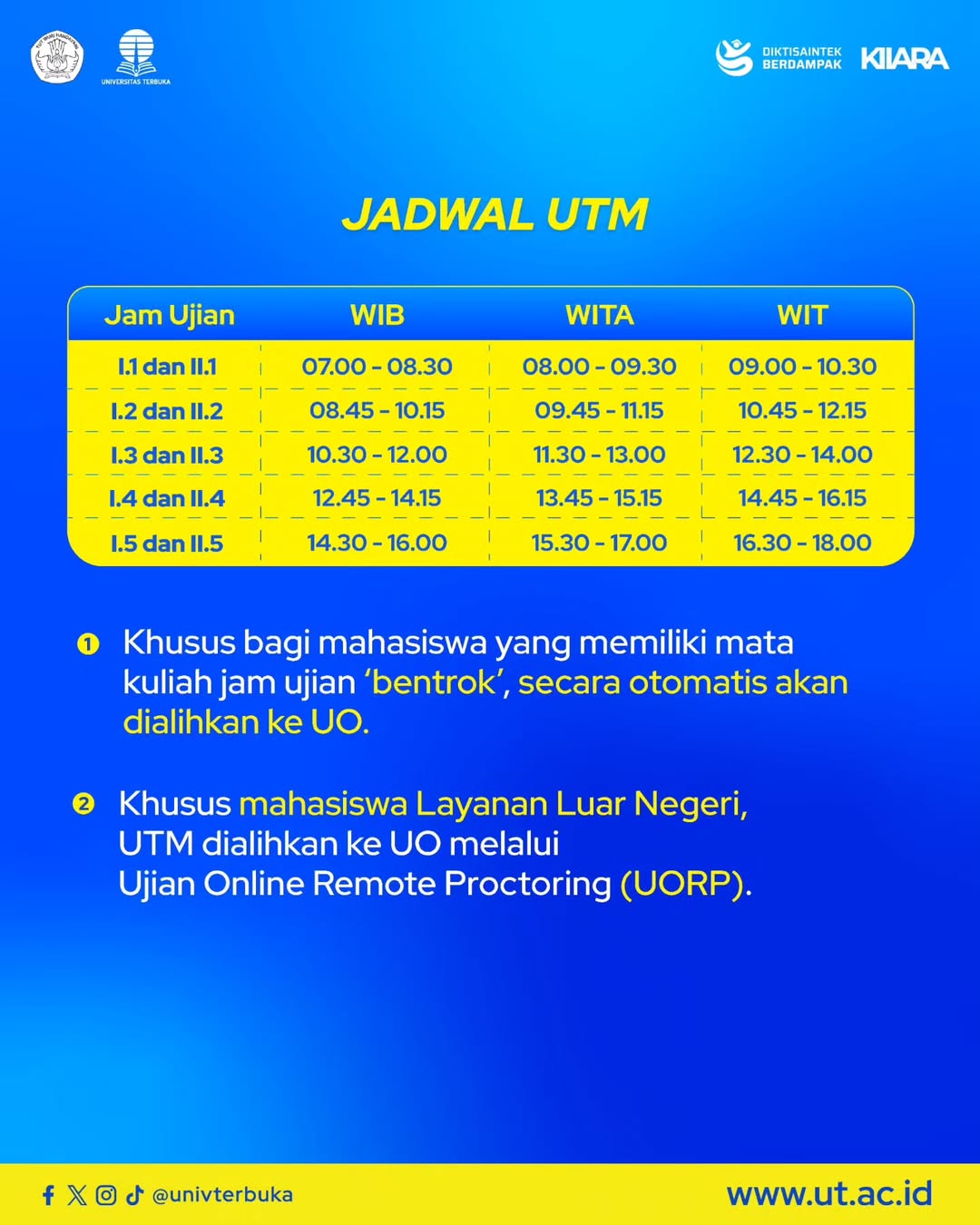 🌍 Untuk mahasiswa Layanan Luar Negeri, UTM akan diberikan melalui UORP (Ujian Online Remote Proctoring) agar tetap bisa mengikuti ujian dengan standar yang sama.
