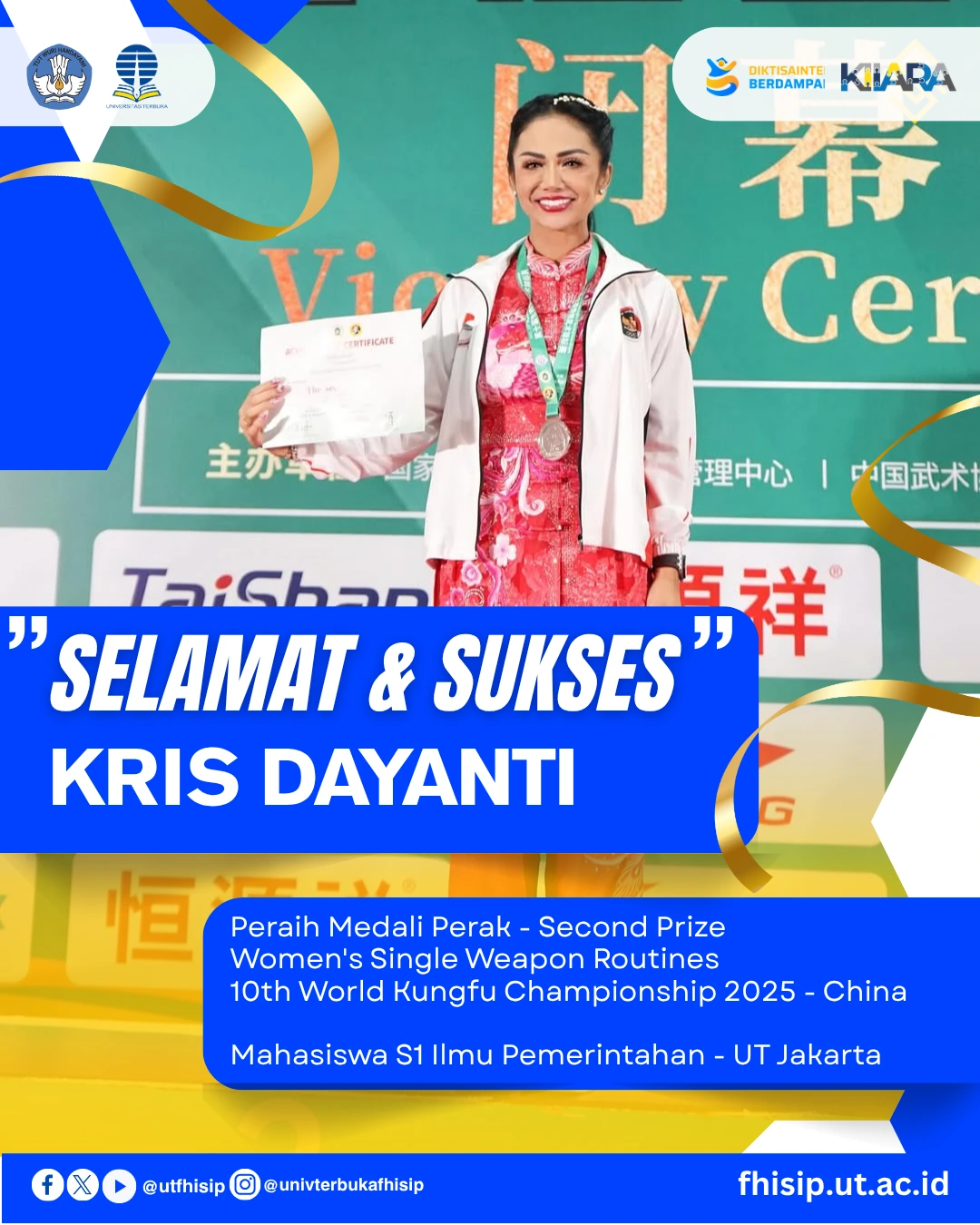 Tangerang Selatan, 21 Oktober 2025 — Diva Indonesia dan tercatat sebagai mahasiswi program studi Ilmu Pemerintahan S-1 FHISIP Universitas Terbuka, Kris Dayanti, kembali menorehkan prestasi membanggakan di kancah internasional. Ia meraih medali perak dalam kategori Women’s Single Weapon Routines pada 10th World Kungfu Championship di Emeishan, China (14–20 Oktober 2025). Ajang ini pertama kali diadakan pada 2004. Tidak seperti kejuaraan wushu yang mempertandingkan nomor-nomor resmi, World Kungfu mencakup banyak kategori usia. Krisdayanti turun di kategori usia 40-59 tahun. Mantan anggota DPR RI ini tampil untuk nomor senjata individu-shanzi.