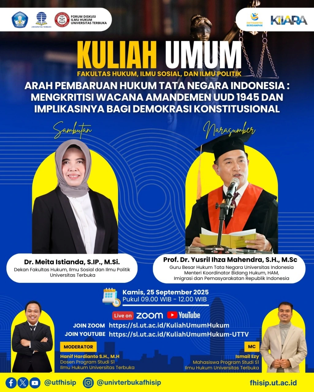 📚 Fakultas Hukum, Ilmu Sosial, dan Ilmu Politik Universitas Terbuka dan Forum Diskusi Mahasiswa Ilmu Hukum Universitas Terbuka mengundang Anda untuk mengikuti kuliah umum dengan tema: