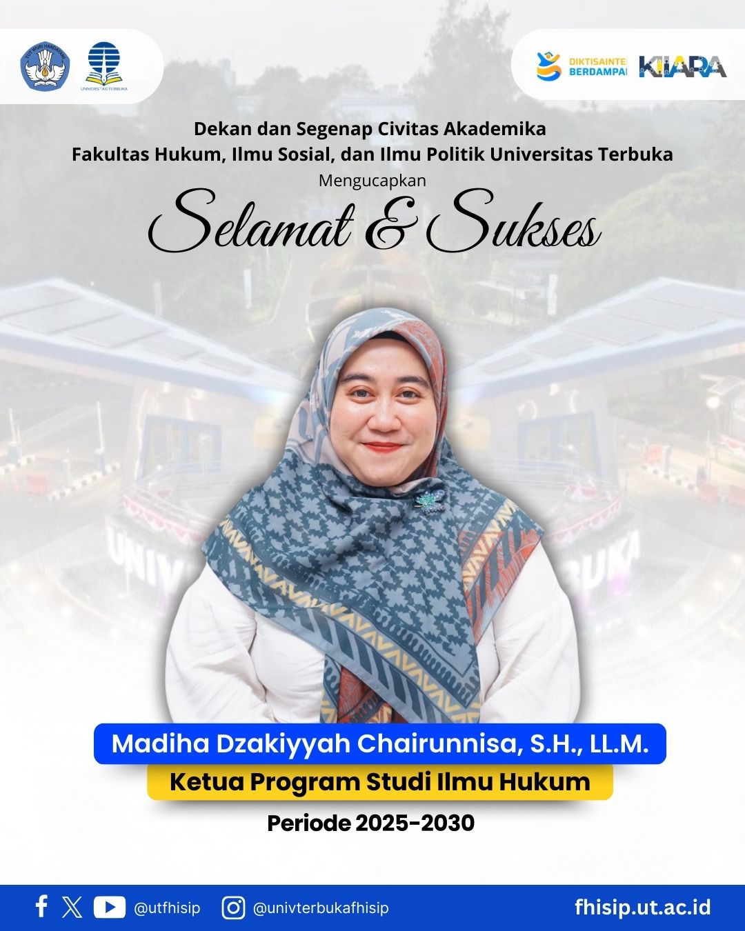 • Selamat dan Sukses Madiha Dzakiyyah Chairunnisa, S.H., LL.M. “Ketua Program Studi Ilmu Hukum FHISIP UT periode 2025-2030”