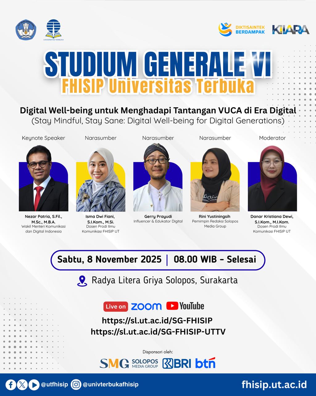 Yuk bekali diri untuk menjaga kesehatan mental di era digital, ikuti Studium Generale VI FHISIP Universitas Terbuka dengan tema : “Digital Well-being untuk Menghadapi Tantangan VUCA di Era Digital (Stay Mindful, Stay Sane: Digital Well-being for Digital Generations)”
